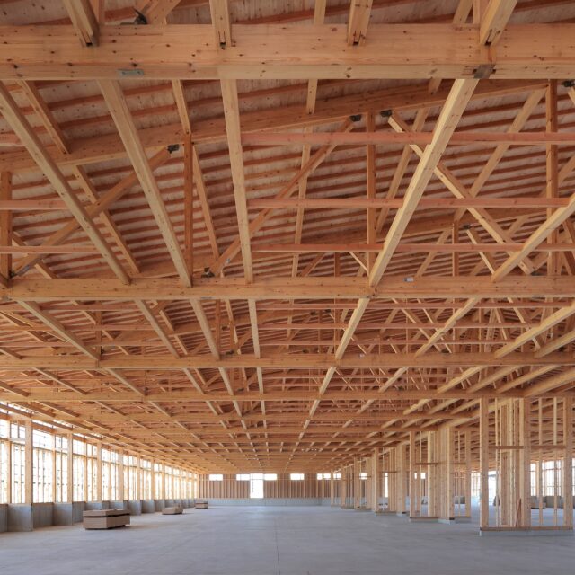 プレカットできるため、倉庫や工場、公共施設などの中大規模な木造建築にも